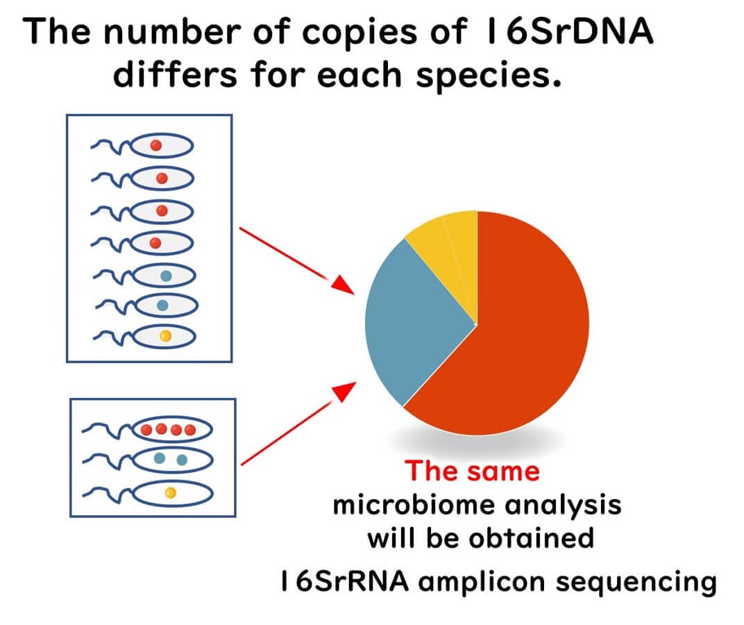 However, if species A had 4 copies, species B had 2 copies, and species C had only 1 copy, their representation in sequencing results would be skewed, making species with higher gene copy numbers appear more abundant than they actually are.