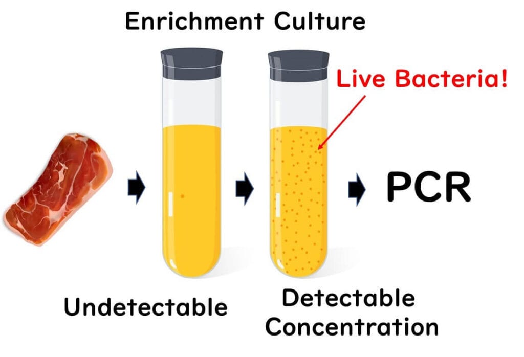 In practical food testing, the limitations of genetic testing are often mitigated through enrichment cultures. PCR testing alone is typically not sensitive enough to detect foodborne pathogens at levels as low as one cell per 25 grams of food. Enrichment cultures, which increase the number of target bacteria to detectable levels, are thus essential in most cases. These cultures provide reliable results for determining the presence of live bacteria.