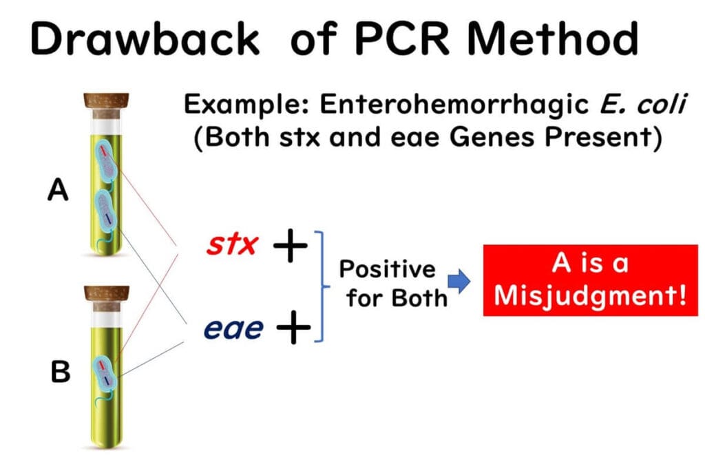 PCR testing is capable of detecting genes directly from enrichment cultures without the need to isolate colonies. However, this method has a significant blind spot, particularly in cases involving pathogenic Escherichia coli (E. coli). Detection often relies on the presence of two target genes, such as stx (Shiga toxin) and eae (intimin).