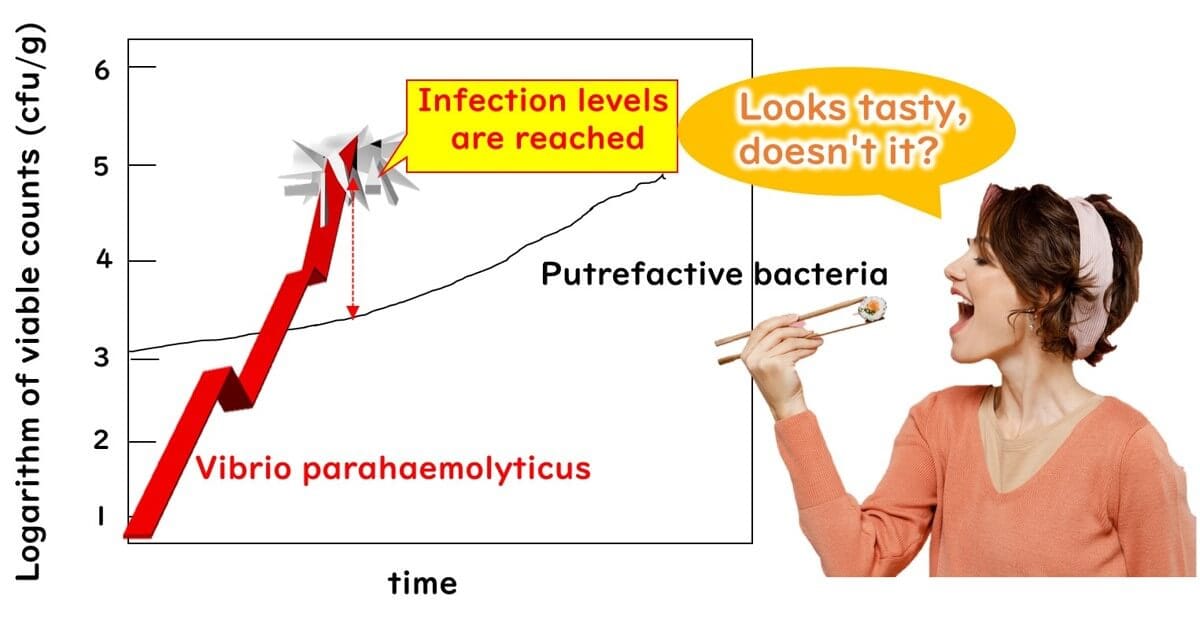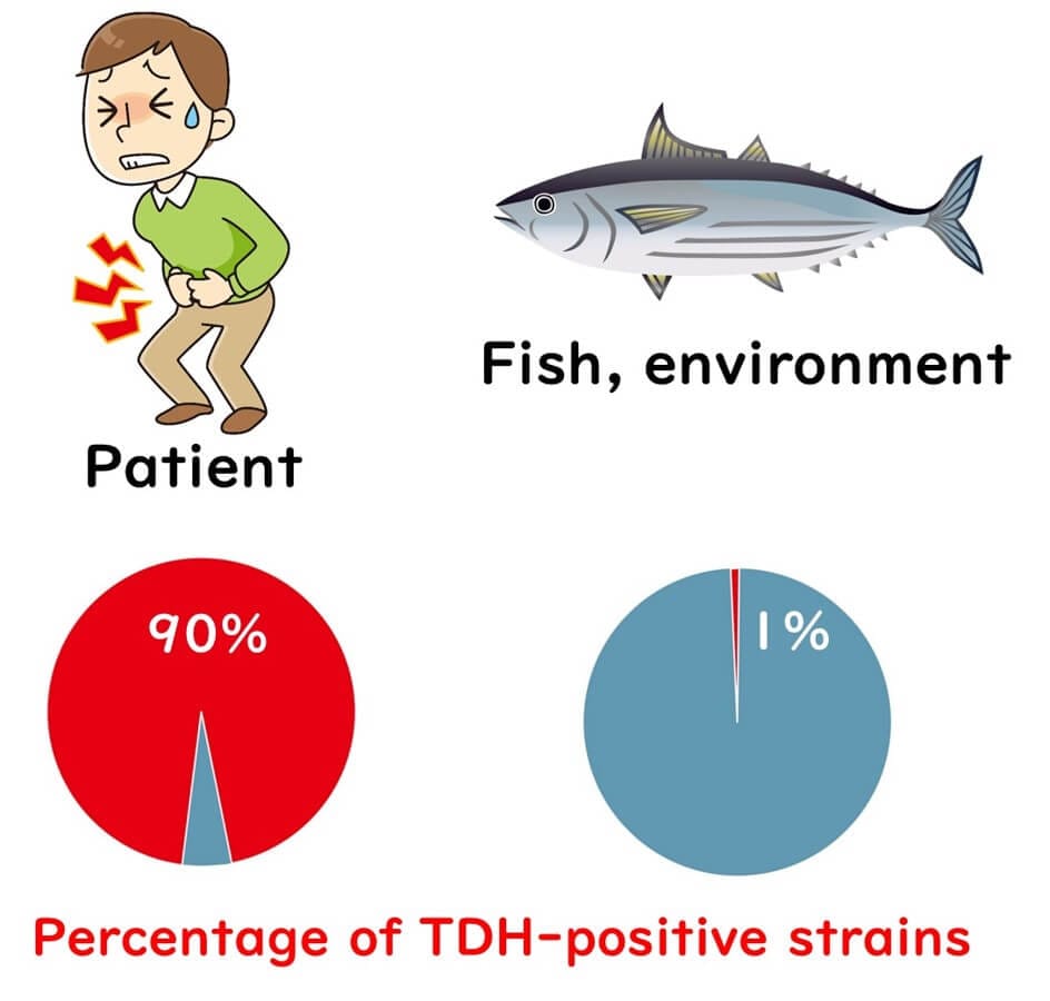However, this count refers to the general presence of Vibrio parahaemolyticus, not just the harmful strains with the TDH (thermostable direct hemolysin) gene, which can cause severe symptoms. Why monitor all Vibrio levels instead of focusing solely on the pathogenic ones? Research in Japan has shown that the dangerous TDH-positive strains represent only about 1% of the total Vibrio parahaemolyticus population in seafood.