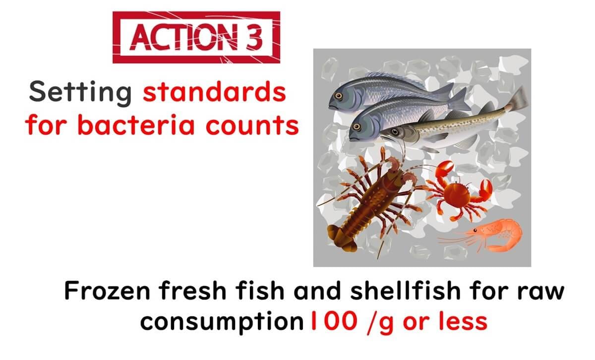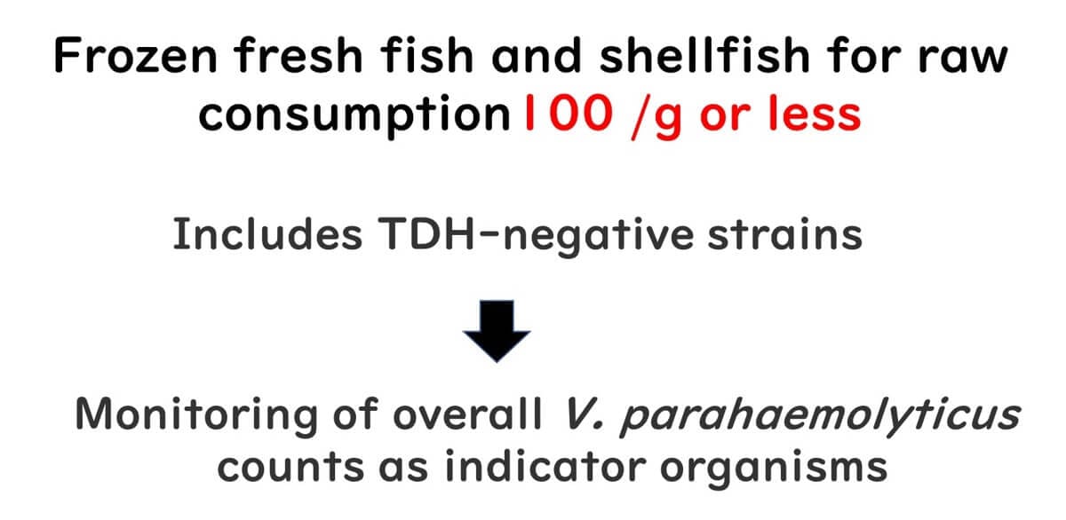 Imagine you’re at a seafood market, eyeing the fresh fish and wondering about its safety. In Japan, there’s a specific hygiene standard for Vibrio parahaemolyticus levels in seafood to ensure it’s safe for raw consumption. This standard requires that Vibrio parahaemolyticus count must be 100 MPN (Most Probable Number) per gram or less.