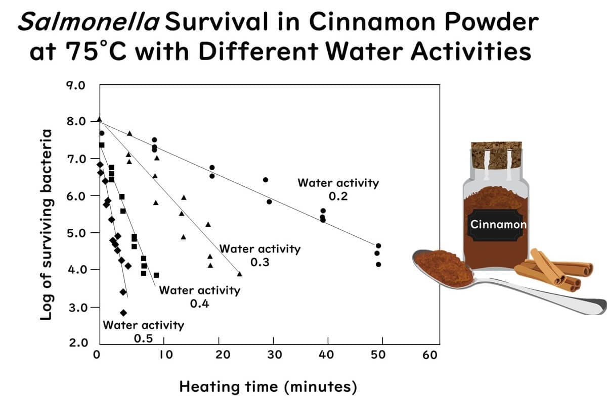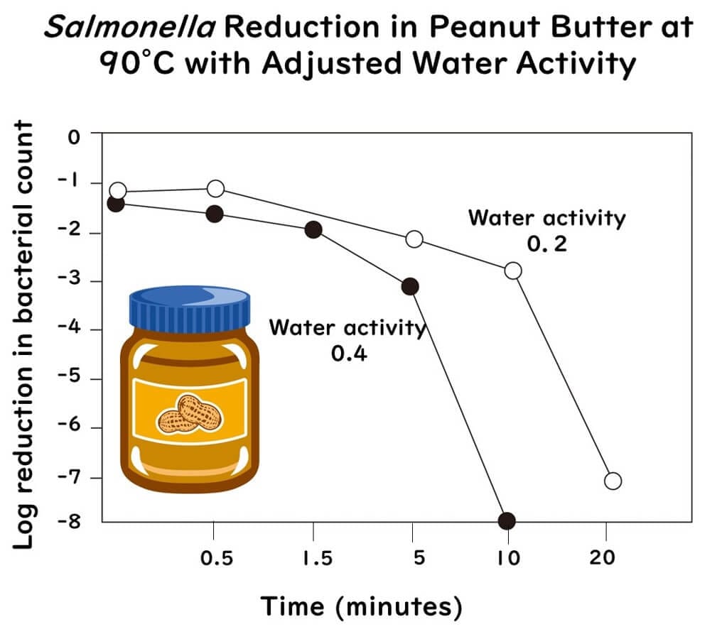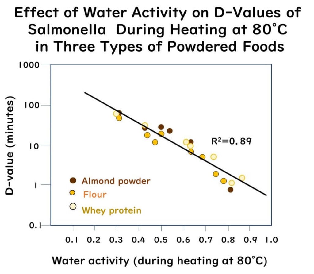 Data from various researchers have shown that even with the same level of water activity, differences in food types can result in different heat resistance (D-values) for Salmonella. This has led to speculation that food components could influence Salmonella’s resistance under low water activity conditions. However, recent studies suggest that these differences are determined by changes in water activity during heating.