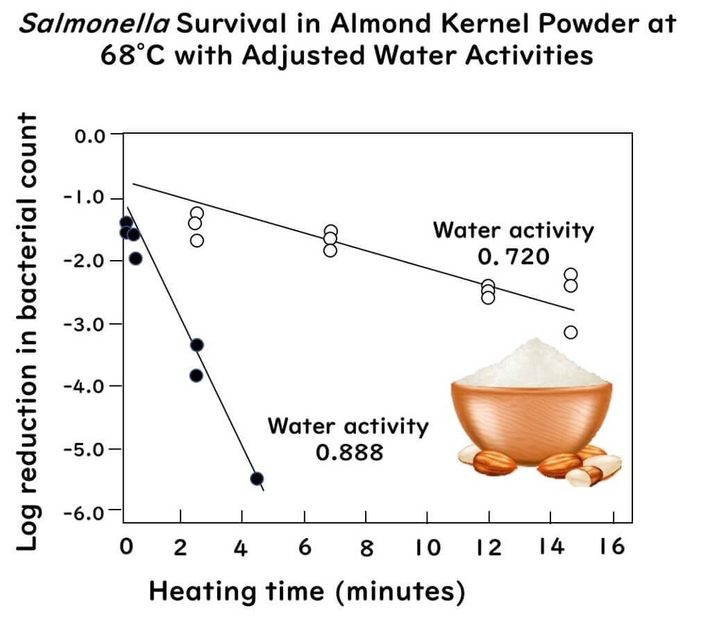 The graph below shows the significant increase in heat resistance of Salmonella Enteritidis in almond kernels powder adjusted to water activities of 0.720 compared to 0.888.