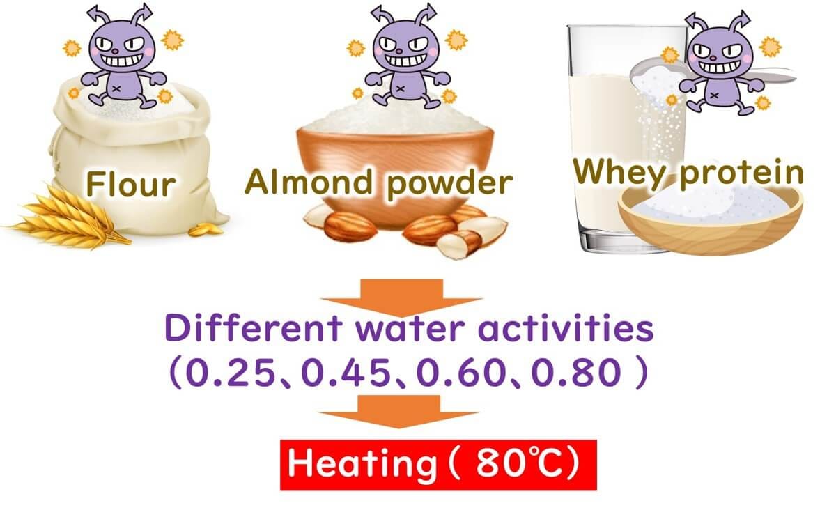 The heat resistance of Salmonella was evaluated in three types of food: flour, almond powder, and whey protein, each representing food groups rich in carbohydrates, fats, and proteins, respectively.