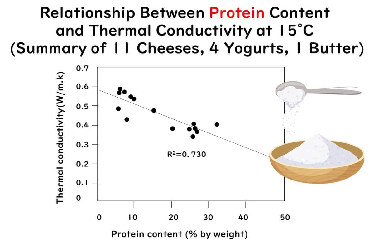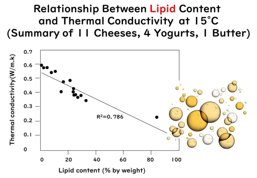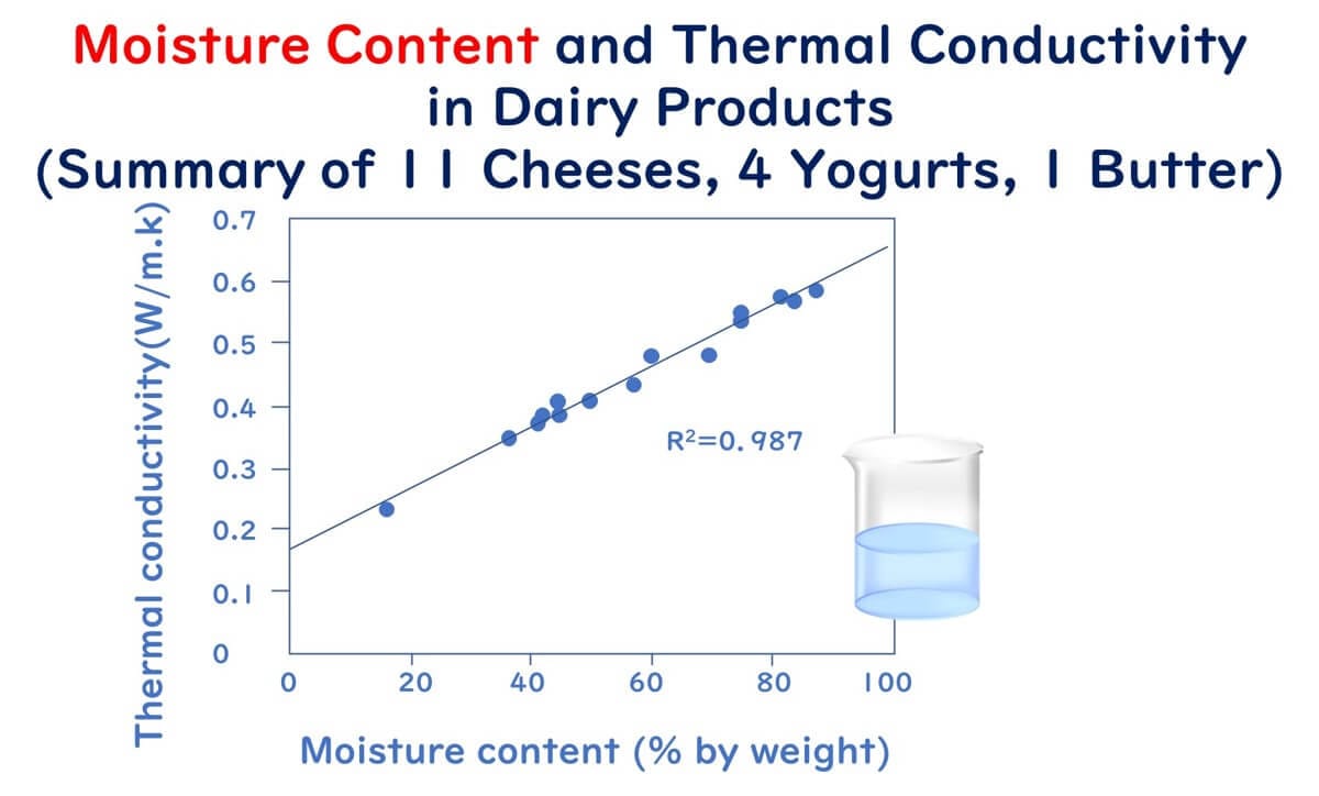 For low-moisture foods, several studies have experimentally demonstrated that thermal conductivity decreases as moisture content decreases. A study by Tavman et al. investigated the thermal conductivity of 11 types of cheese, four types of yoghurt, and one type of butter. The research revealed that: