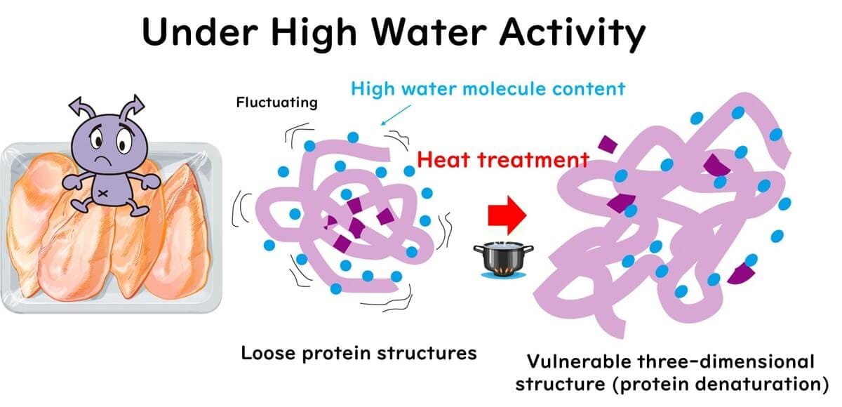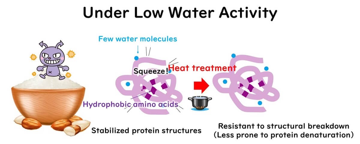 In low water activity conditions, these hydration waters decrease, resulting in the loss of structural flexibility in proteins. The loss of protein flexibility means that hydrophobic sites in enzymes become structurally rigid and buried, making them less likely to be exposed during heating. Therefore, low water activity makes it difficult to inactivate enzymes.